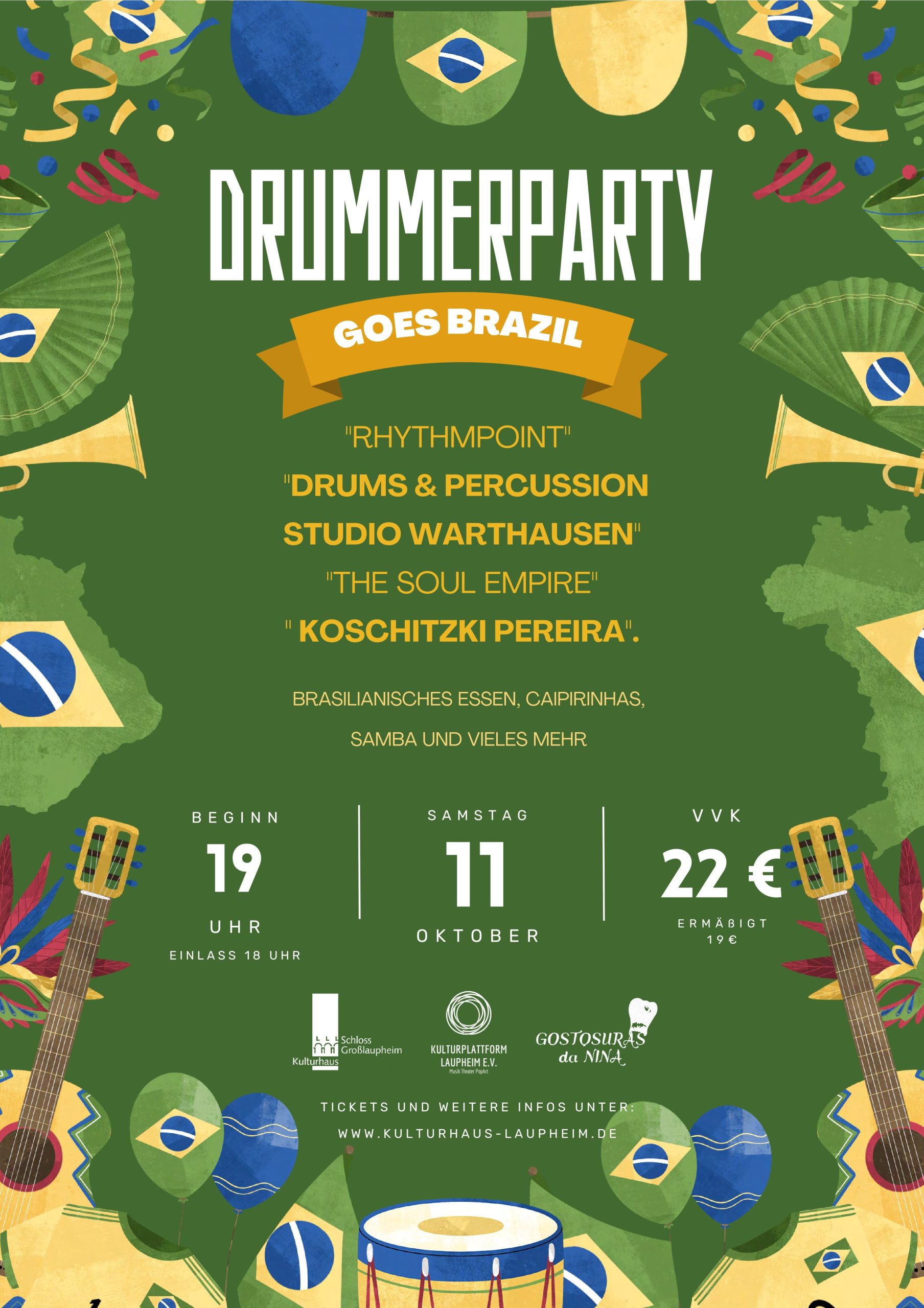 Am Samstag, den 11. Oktober 2025, verwandelt sich das Kulturhaus Laupheim in ein Stück Brasilien. Unter dem Motto „Drummerparty goes Brazil“ erwartet die Gäste ein Abend voller mitreißender Rhythmen, brasilianischem Flair und purer Lebensfreude.